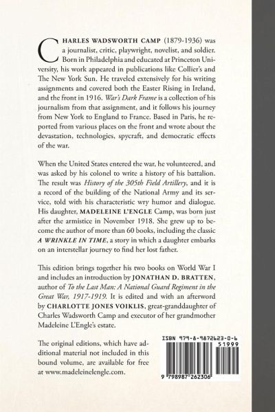 Charles Wadsworth Camp (1879-1936) was a journalist, critic, playwright, novelist, and soldier. Born in Philadelphia and educated at Princeton University, his work appeared in publications like Collier's and The New York Sun. He met the pianist Madeleine Barnett Camp at a wedding in Jacksonville, Florida, and they were married. Together they traveled extensively for his writing assignments until the outbreak of World War I. Charles covered both the Easter Rising in Ireland, and the front in 1916. War's Dark Frame is a collection of his journalism from that assignment, and it follows his journey from New York to England to France. Based in Paris, he reported from various places on the front and wrote about the devastation, technologies, spycraft, and democratic effects of the war. When the United States entered the war, he volunteered, and was asked by his colonel to write a history of his battalion. The result was History of the 305th Field Artillery, and it is a record of the building of the National Army and its service, told with his characteristic wry humor and dialogue. His daughter, Madeleine L'Engle Camp, was born just after the armistice in November 1918, but he didn't return home until May 1919. He was exposed to toxic gas during deployment and suffered from recurring pneumonia as a result. He died at age 57 after catching a cold at a Princeton football game. Daughter Madeleine grew up to become the author of more than 60 books, including the classic A Wrinkle in Time, a story in which a daughter embarks on an interstellar journey to find her lost father. This edition brings together his two books on World War I and includes an introduction by Jonathan D. Bratten, author of To the Last Man: A National Guard Regiment in the Great War, 1917-1919. It is edited and with an afterword by Charlotte Jones Voiklis, great-granddaughter of Charles Wadsworth Camp and executor of her grandmother Madeleine L'Engle's estate. The original editions, which have additional material not included in this bound volume, are available for free at www.madeleinelengle.com