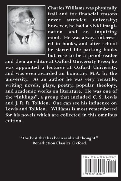 "There is nothing else that is like them or that could take their place." - T. S. Eliot "I have just read your "Place of the Lion" and it is to me one of the major literary events of my life ... There are layers and layers-first the pleasure that any good fantasy gives me: then, what is rarely (tho' not so very rarely) combined with this, the pleasure of a real philosophical and theological stimulus: thirdly, characters: fourthly, what I neither expected nor desired, substantial edification." - C. S. Lewis "I want to make clear that these novels of Williams ... are, first of all, very good reading. To him [Williams] the supernatural was perfectly natural, and the natural was also supernatural. And this peculiarity gave him that profound insight into Good and Evil, into the heights of Heaven and the depths of Hell, which provides both the immediate thrill, and the permanent message of novels. Williams is telling us about a world of experience known to him ... he communicates this experience that he has had. These five "supernatural thrillers" are all set in the modern world but present human life as being controlled by unseen powers that operate at another level. In this respect, they are very similar to the Harry Potter series. The reader is shown that the supernatural is, in fact, perfectly natural, and exerts an influence on every aspect of our daily existence. On one level, these novels are gripping stories, but at another, they are a unique blend of fantasy, theology, morality and the supernatural which has not been surpassed, and which leave a deep impression on the reader. Charles Williams was physically frail and for financial reasons never attended university; however, he had a vivid imagination and an inquiring mind. He was always interested in books, and after school he started life packing books but rose to be a proof-reader and then an editor at Oxford University Press; he was appointed a lecturer at Oxford University, and was even awarded an honorary M.A. by the university. As an author he was very versatile, writing novels, plays, poetry, popular theology, and academic works on literature. He was one of the "Inklings", a group that included C. S. Lewis and J. R. R. Tolkien. One can see his influence on Lewis and Tolkien. Williams is most remembered for his novels. This edition contains the five novels War in Heaven, Many Dimensions, The Place of the Lion, Shadows of Ecstasy, and Descent into Hell, and also the short story, Et in Sempiternum Pereant, which features the protagonist of Many Dimensions.