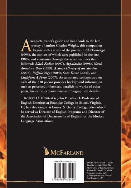 This work offers a complete reader's guide and handbook to the late poetry of author Charles Wright. It begins with a study of the poems in Chickamauga (1995), the earliest of which were published in the late 1980s, and continues through the seven volumes that followed: Black Zodiac (1997), Appalachia (1998), North American Bear (1999), A Short History of the Shadow (2002), Buffalo Yoga (2004), Scar Tissue (2006), and Littlefoot: A Poem (2007). The author includes an annotated commentary for each of the 230 poems covered in the work, providing background information such as perceived influences, parallels to other poets, historical explanations, and biographical details.