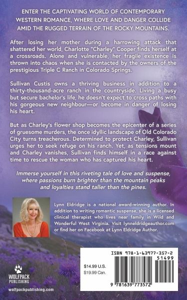 Enter the captivating world of contemporary western romance, where love and danger collide amid the rugged terrain of the Rocky Mountains. After losing her mother during a harrowing attack that shattered her world, Charlotte "Charley" Cooper finds herself at a crossroads. Alone and vulnerable, her fragile existence is thrown into chaos when she is contacted by the owners of the prestigious Triple C Ranch in Colorado Springs. Sullivan Custis owns a thriving business in addition to a thirty-thousand-acre ranch in the countryside. Living a busy but secure bachelor's life, he doesn't expect to cross paths with his gorgeous new neighbour-or become in danger of losing his heart. But as Charley's flower shop becomes the epicenter of a series of gruesome murders, the once idyllic landscape of Old Colorado City turns treacherous. Determined to protect Charley, Sullivan urges her to seek refuge on his ranch. Yet, as tensions mount and Charley vanishes, Sullivan finds himself in a race against time to rescue the woman who has captured his heart. Immerse yourself in this riveting tale of love and suspense, where passions burn brighter than the mountain peaks and loyalties stand taller than the pines. "If you love western romance, Lynn Eldridge's Triple C Ranch series is a must read!" -Kat Martin, New York Times bestselling author