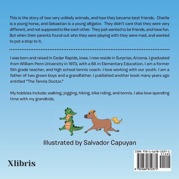 This is the story of two very unlikely animals, and how they became best friends. Charlie is a young horse, and Sebastian is a young alligator. They didn't care that they were very different, and not supposed to like each other. They just wanted to be friends, and have fun. When Sebastian's mom and dad found out that they were friends they were very upset, didn't like them playing together, and were going to put a stop to it! However, once they, and Charlie's mom and dad saw them playing and having fun, they changed their minds, and decided just maybe they could be friends after all.