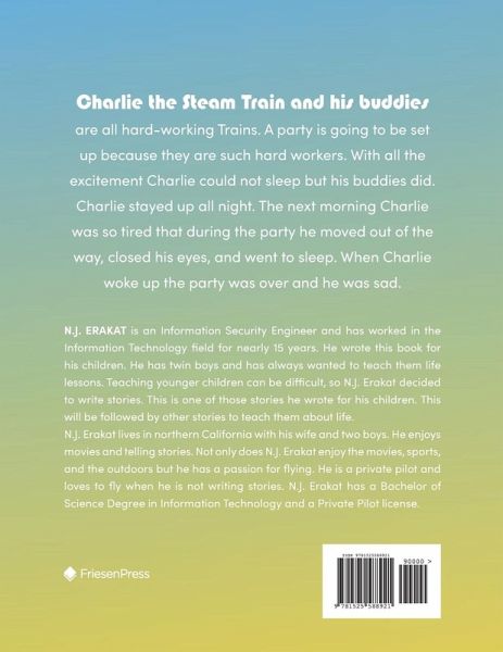 Charlie the Steam Train and his buddies are all hard-working Trains. A party is going to be set up because they are such hard workers. With all the excitement Charlie could not sleep but his buddies did. Charlie stayed up all night. The next morning Charlie was so tired that during the party he moved out of the way, closed his eyes, and went to sleep. When Charlie woke up the party was over and he was sad.