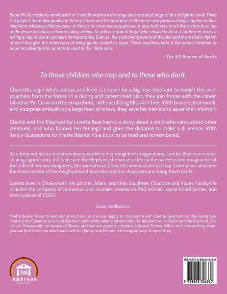Charlotte, a girl who's curious and kind, is chosen by a big blue elephant to banish the cruel poachers from the forest. In a daring and determined plan, they join forces with the clever, talkative Mr. Crow and the empathetic, self-sacrificing Miss Ash Tree. With bravery, teamwork, and a surprise ambush by a large flock of crows, they save her friend and savor their triumph! Charlie and the Elephant by Loretta Beacham is a story about a child who cares about other creatures, one who follows her feelings and goes the distance to make a diference. With lovely illustrations by Yvette Besner, it's a book to be read and remembered.