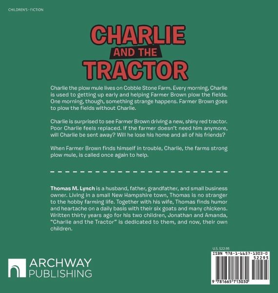 Charlie the plow mule lives on Cobble Stone Farm. Every morning, Charlie is used to getting up early and helping Farmer Brown plow the fields. One morning, though, something strange happens. Farmer Brown goes to plow the fields without Charlie. Charlie is surprised to see Farmer Brown driving a new, shiny red tractor. Poor Charlie feels replaced. If the farmer doesn't need him anymore, will Charlie be sent away? Will he lose his home and all of his friends? When Farmer Brown finds himself in trouble, Charlie, the farms strong plow mule, is called once again to help.