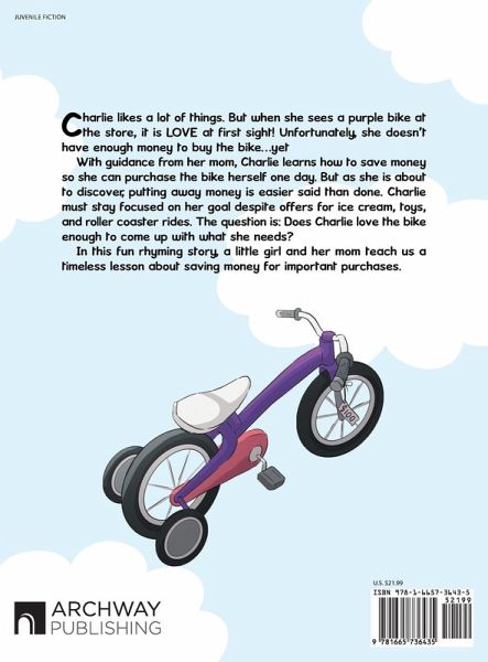 Charlie likes a lot of things. But when she sees a purple bike at the store, it is LOVE at first sight! Unfortunately, she doesn't have enough money to buy the bike...yet With guidance from her mom, Charlie learns how to save money so she can purchase the bike herself one day. But as she is about to discover, putting away money is easier said than done. Charlie must stay focused on her goal despite offers for ice cream, toys, and roller coaster rides. The question is: Does Charlie love the bike enough to come up with what she needs? In this fun rhyming story, a little girl and her mom teach us a timeless lesson about saving money for important purchases.