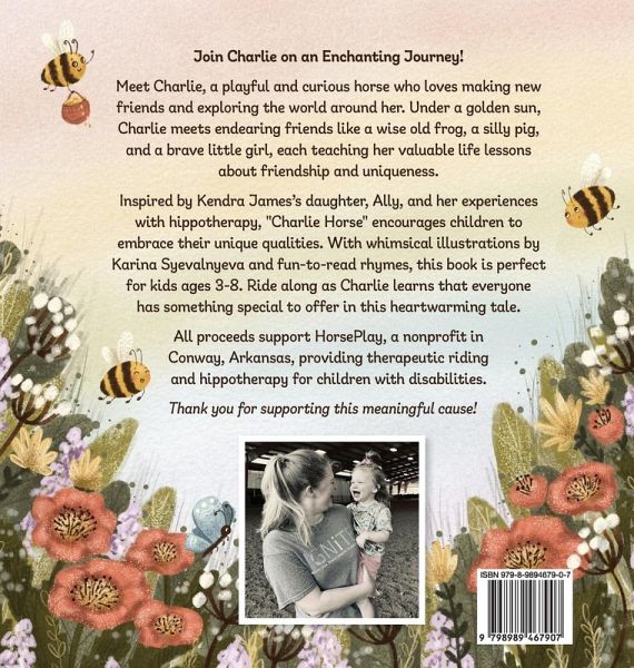 Meet Charlie, a spirited horse on a captivating journey of friendship and self-discovery. Beneath a golden sun, Charlie's adventures introduce her to a host of unique animal friends, each with their own special abilities and life lessons. In this beautifully illustrated picture book, children will learn the importance of acceptance, empathy, and celebrating differences. Charlie's encounters with a bunny, frog, duck, turtle, butterfly, pig, bee, ladybug, and more, teach her-and young readers-valuable lessons about embracing one's own unique gifts and the magic of kindness. "Charlie Horse is such a cute and encouraging story about making friends and embracing differences! All of the rhymes and talking animals make it a lot of fun to read." - Jordan Easley, Photographer & Mom "A beautifully written book that reminds my children we are all on our own journey. This book is a constant reminder that our God-given gifts are all a part of His perfect design." - Hailee Fruchey, Stay at Home Mom of 3 Perfect for children aged 3-7, this enchanting story is ideal for bedtime reading and classroom discussions. With its engaging rhymes and vibrant illustrations, "Charlie Horse" is sure to become a cherished favorite in any child's library. Discover the joy of Charlie's journey and the heartwarming message that every child is extraordinary, just the way they are. "My daughter and I absolutely adored [Charlie Horse] and loved Charlie! This book is a piece of positivity that was definitely needed and missing. No doubt, this is a story we will keep and treasure!" - Lindsey Thomas, Former Teacher & Mom Join Charlie and her friends in this delightful adventure that encourages children to march to their own beat and cherish each other's differences. All proceeds from this book support HorsePlay, a nonprofit in Conway, Arkansas, providing therapeutic riding and Hippotherapy for children with disabilities. Thank you for supporting this meaningful cause!