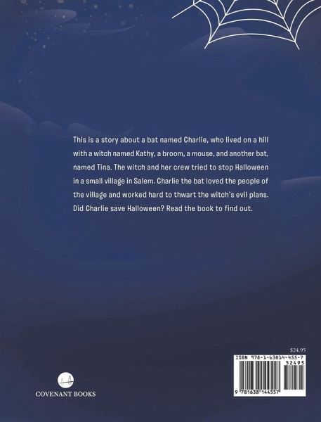 This is a story about a bat named Charlie, who lived on a hill with a witch named Kathy, a broom, a mouse, and another bat, named Tina. The witch and her crew tried to stop Halloween in a small village in Salem. Charlie the bat loved the people of the village and worked hard to thwart the witch's evil plans. Did Charlie save Halloween? Read the book to find out.