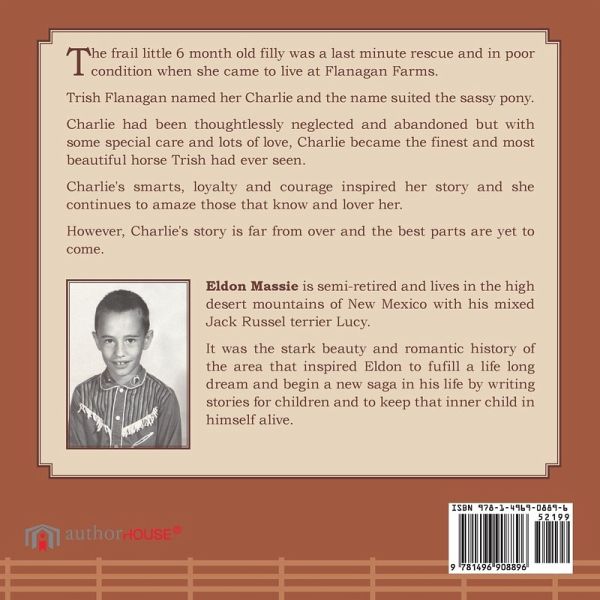 The frail little 6 month old filly was a last minute rescue and in poor condition when she came to live at Flanagan Farms. Trish Flanagan named her Charlie and the name suited the sassy pony. Charlie had been thoughtlessly neglected and abandoned but with some special care and lots of love, Charlie became the finest and most beautiful horse Trish had ever seen. Charlie's smarts, loyalty and courage inspired her story and she continues to amaze those that know and lover her. However, Charlie's story is far from over and the best parts are yet to come.