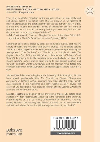 Justine Pizzo is a Lecturer in English at the University of Southampton, UK. Her book project, provisionally titled "The Character of Climate: Woman and Atmosphere in Victorian Fiction," examines how aerial climates shape female characterization in mid-nineteenth and early twentieth-century novels. Her essays on Charlotte Brontë have appeared in PMLA and in a volume on Climate and Literature  (ed. Johns-Putra, 2019) published by Cambridge University Press.   Eleanor Houghton read English at the University of Oxford, UK, before being awarded a Wolfson Postgraduate Scholarship in the Humanities at the University of Southampton, UK. She has recently completed her doctoral thesis "Charlotte Brontë, 'Plainness' and the Language of Dress" and works as costume consultant and historical advisor for the Brontë Parsonage Museum, UK, and the BBC.