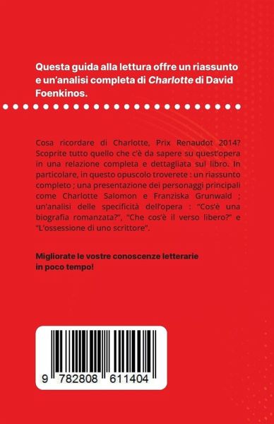 Cosa ricordare di Charlotte, Prix Renaudot 2014? Scoprite tutto quello che c'è da sapere su quest'opera in una relazione completa e dettagliata sul libro. In particolare, in questo opuscolo troverete : - Un riassunto completo - Una presentazione dei personaggi principali come Charlotte Salomon e Franziska Grunwald - Un'analisi delle specificità dell'opera: cos'è una biografia romanzata? Che cos'è il verso libero? L'ossessione di uno scrittore Un'analisi dei riferimenti per comprendere rapidamente il significato dell'opera.