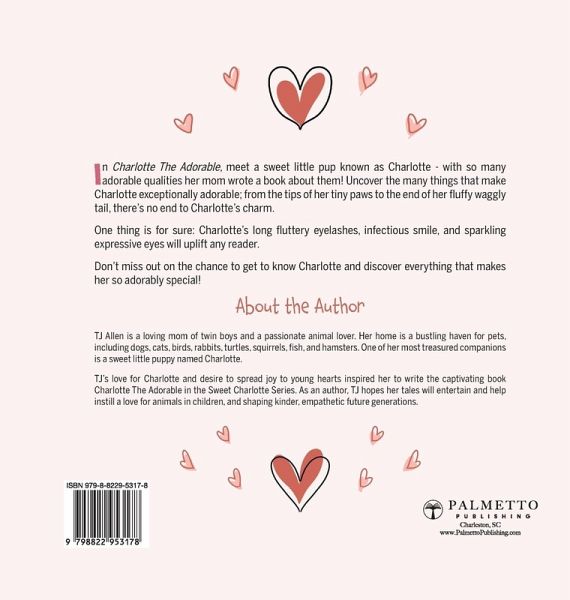 Explore the delightful features of the lovable Charlotte! Marvel at her charming waggly tail, be enchanted by her long eyelashes and fall in love with every bit of her endearing personality. In Charlotte The Adorable, meet a sweet little pup known as Charlotte-with so many adorable qualities her mom wrote a book about them! Uncover the many things that make Charlotte exceptionally adorable; from the tips of her tiny paws to the end of her fluffy waggly tail - there's no end to Charlotte's charm. Perfect for dog lovers and children unsure of how they feel about dogs, Charlotte the Adorable is the perfect read because it describes the many different faces, sounds, and reactions a dog can have. Dog lovers will laugh and "aww" at each new image of Charlotte's expressions-and kids still learning to like dogs get to experience the range of emotions a pup can have from a safe distance. One thing is for sure: Charlotte's long fluttery eyelashes, infectious smile, and sparkling expressive eyes will uplift any reader. Charlotte The Adorable is a tale that celebrates the simple joys of life and the magic of spending every day with a dog. From her sweet feet to her fluffy head, Charlotte's zest for life and adorable appearance brings a smile to all who see her face and learn of her adventures. Don't miss out on the chance to get to know Charlotte and discover everything that makes her so adorably special!