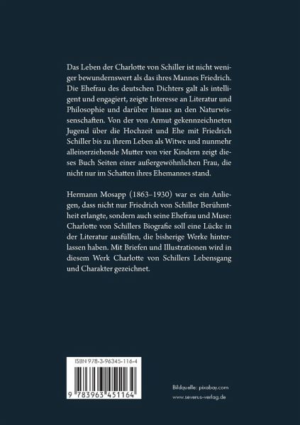 Hermann Mosapp (1863-1930) war es ein Anliegen, dass nicht nur Friedrich von Schiller Berühmtheit erlangte, sondern auch seine Ehefrau und Muse: Charlotte von Schillers Biografie soll eine Lücke in der Literatur ausfüllen, die bisherige Werke hinterlassen haben. Mit Briefen und Illustrationen wird in diesem Werk Charlotte von Schillers Lebensgang und Charakter gezeichnet.