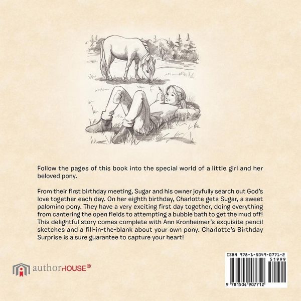 Follow the pages of this book into the special world of a little girl and her beloved pony. From their first birthday meeting, Sugar and his owner joyfully search out God's love together each day. On her eighth birthday, Charlotte gets Sugar, a sweet palomino pony. They have a very exciting first day together, doing everything from cantering the open fields to attempting a bubble bath to get the mud off! This delightful story comes complete with Ann Kronheimer's exquisite pencil sketches and a fill-in-the-blank about your own pony. Charlotte's Birthday Surprise is a sure guarantee to capture your heart!