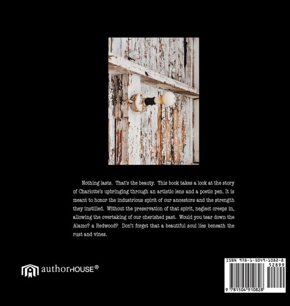 Nothing lasts. That's the beauty. This book takes a look at the story of Charlotte's upbringing through an artistic lens and a poetic pen. It is meant to honor the industrious spirit of our ancestors and the strength they instilled. Without the preservation of that spirit, neglect creeps in, allowing the overtaking of our cherished past. Would you tear down the Alamo? a Redwood? Don't forget that a beautiful soul lies beneath the rust and vines.