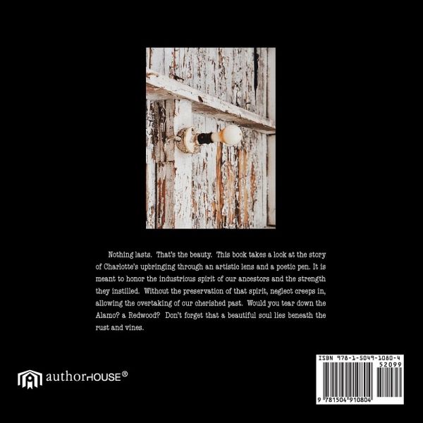 Nothing lasts. That's the beauty. This book takes a look at the story of Charlotte's upbringing through an artistic lens and a poetic pen. It is meant to honor the industrious spirit of our ancestors and the strength they instilled. Without the preservation of that spirit, neglect creeps in, allowing the overtaking of our cherished past. Would you tear down the Alamo? a Redwood? Don't forget that a beautiful soul lies beneath the rust and vines.
