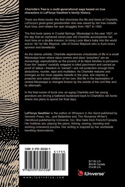 Charlotte's Tree is a multi-generational saga based on true characters in LaFlorya Gauthier's family history. There are three books: the first chronicles the life and times of Charlotte, LaFlorya's great-great grandmother who was raised by her free midwife Aunt Iona, and relates her epic struggles from 1827 to 1902. The first book opens in Crystal Springs, Mississippi in the year 1827, on the day that an orphaned seven-year old Charlotte accompanies her Aunt Iona on a double mission: to bring Lucie Mae's baby into the world and to "do" for Miz Blaylock, wife of Doctor Blaylock who is Aunt Iona's sponsor and benefactor. As the drama unfolds, Charlotte experiences vicissitudes of life in a small Mississippi town where slave owners and slave "poachers" are as menacingly unpredictable as the poverty of its black families is pervasive. Even the "papers" carefully wrapped in oiled parchment and carried as proof of status--freedom or "owned"--are not protection enough from abductions, murder, rape and mutilation. As Charlotte matures and emerges as the most capable midwife in the area, she marries a preacher and raises children of her own. But life in the backwaters of central Mississippi is changed forever by the events of the civil War and its aftermath. In the final scene of book one, an aging Charlotte and her young grandson are driving a battered buckboard back to Charlotte's old home where she plans to spend her final days.