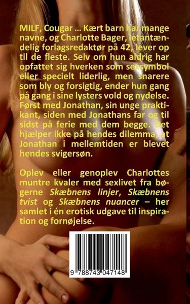 MILF, Cougar ... Kært barn har mange navne, og Charlotte Bager, letantændelig forlagsredaktør på 42, lever op til de fleste. Selv om hun aldrig har opfattet sig hverken som sexsymbol eller specielt liderlig, men snarere som bly og forsigtig, ender hun gang på gang i sine lysters vold og nydelse. Først med Jonathan, sin unge praktikant, siden med Jonathans far og til sidst på ferie med dem begge. Det hjælper ikke på hendes dilemma, at Jonathan i mellemtiden er blevet hendes svigersøn. Oplev eller genoplev Charlottes muntre kvaler med sexlivet fra bøgerne Skæbnens linjer, Skæbnens tvist og Skæbnens nuancer - her samlet i én erotisk udgave til inspiration og fornøjelse.