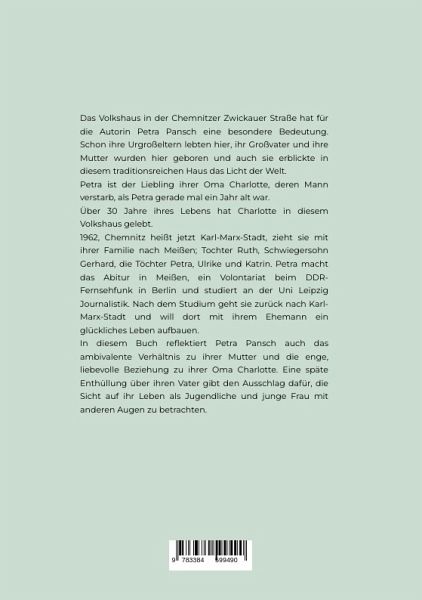 Das Volkshaus in der Chemnitzer Zwickauer Straße hat für die Autorin Petra Pansch eine besondere Bedeutung. Schon ihre Urgroßeltern lebten hier, ihr Großvater und ihre Mutter wurden hier geboren und auch sie erblickte in diesem traditionsreichen Haus das Licht der Welt.Petra ist der Liebling ihrer Oma Charlotte, deren Mann verstarb, als Petra gerade mal ein Jahr alt war. Über 30 Jahre ihres Lebens hat Charlotte in diesem Volkshaus gelebt.1962, Chemnitz heißt jetzt Karl-Marx-Stadt, zieht sie mit ihrer Familie nach Meißen; Tochter Ruth, Schwiegersohn Gerhard, die Enkel Petra, Ulrike und Katrin. Petra macht das Abitur in Meißen, ein Volontariat beim DDR-Fernsehfunk in Berlin und studiert an der Uni Leipzig Journalistik. Nach dem Studium geht sie zurück nach Karl-Marx-Stadt und will dort mit ihrem Ehemann ein glückliches Leben aufbauen.In diesem Buch reflektiert Petra Pansch auch das ambivalente Verhältnis zu ihrer Mutter und die enge, liebevolle Beziehung zu ihrer Oma Charlotte. Eine späte Enthüllung über ihren Vater gibt den Ausschlag dafür, die Sicht auf ihr Leben als Jugendliche und junge Frau mit anderen Augen zu betrachten.
