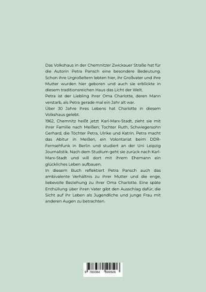 Das Volkshaus in der Chemnitzer Zwickauer Straße hat für die Autorin Petra Pansch eine besondere Bedeutung. Schon ihre Urgroßeltern lebten hier, ihr Großvater und ihre Mutter wurden hier geboren und auch sie erblickte in diesem traditionsreichen Haus das Licht der Welt.Petra ist der Liebling ihrer Oma Charlotte, deren Mann verstarb, als Petra gerade mal ein Jahr alt war. Über 30 Jahre ihres Lebens hat Charlotte in diesem Volkshaus gelebt.1962, Chemnitz heißt jetzt Karl-Marx-Stadt, zieht sie mit ihrer Familie nach Meißen; Tochter Ruth, Schwiegersohn Gerhard, die Enkel Petra, Ulrike und Katrin. Petra macht das Abitur in Meißen, ein Volontariat beim DDR-Fernsehfunk in Berlin und studiert an der Uni Leipzig Journalistik. Nach dem Studium geht sie zurück nach Karl-Marx-Stadt und will dort mit ihrem Ehemann ein glückliches Leben aufbauen.In diesem Buch reflektiert Petra Pansch auch das ambivalente Verhältnis zu ihrer Mutter und die enge, liebevolle Beziehung zu ihrer Oma Charlotte. Eine späte Enthüllung über ihren Vater gibt den Ausschlag dafür, die Sicht auf ihr Leben als Jugendliche und junge Frau mit anderen Augen zu betrachten.
