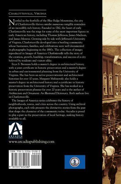 Nestled in the foothills of the Blue Ridge Mountains, the city of Charlottesville thrives amidst numerous tangible reminders of an incredibly rich history. Founded in 1762, the heart of early Charlottesville was the stage for some of the most important figures in early American history, including Thomas Jefferson, James Madison, and James Monroe. Growing side by side with Jefferson s University of Virginia, Charlottesville developed into a bustling community whose businesses, families, and celebrations were well documented in photographs beginning in the 1880s. The collection of images reproduced in Images of America: Charlottesville tells the story of the creation, growth, hardship, transformation, and success of a city beloved by residents and visitors alike."
