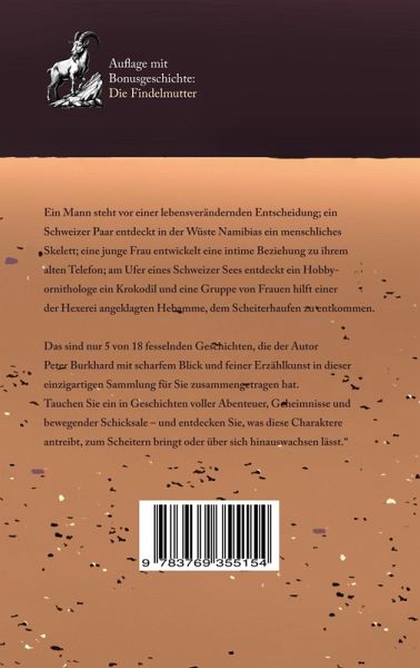 Ein Mann steht vor einer lebensverändernden Entscheidung; ein Schweizer Paar entdeckt in der Wüste Namibias ein menschliches Skelett; eine junge Frau entwickelt eine intime Beziehung zu hrem alten Telefon; am Ufer eines Schweizer Sees entdeckt ein Hobby-ornithologe ein Krokodil und eine Gruppe von Frauen hilft einer der Hexerei angeklagten Hebamme, dem Scheiterhaufen zu entkommen. Das sind nur 5 von 18 fesselnden Geschichten, die der Autor Peter Burkhard mit scharfem Blick und feiner Erzählkunst in dieser einzigartigen Sammlung für Sie zusammengetragen hat. Tauchen Sie ein in Geschichten voller Abenteuer, Geheimnisse und bewegender Schicksale - und entdecken Sie, was diese Charaktere antreibt, zum Scheitern bringt oder über sich hinauswachsen lässt."