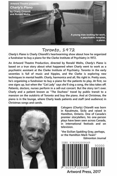 The true story of a young man in the heady, hippie days of 1970s Toronto, who gets a job as a psychiatric assistant in a famous mental hospital. He decides they need a piano, and organizes a Variety Show with patients, nurses and doctors to raise the money they need. A one-person play produced in 2017 by Artword Theatre and performed by Charly Chiarelli and Ronald Weihs.