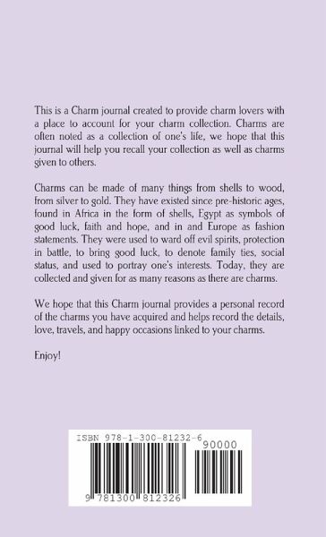 This is a simple personal journal to remember and track the charms you acquire and those given to others. Never forget the special moments, occasions, and details your charms represent. Over time, as you acquire charms the tiny details can fade, now you can insure that you will recall all those important details your charms represent and pass those details on to others. Log your charms in this small organized book meant to be kept close to you when shopping for your next charm, or close to your jewelry box to recall memories.