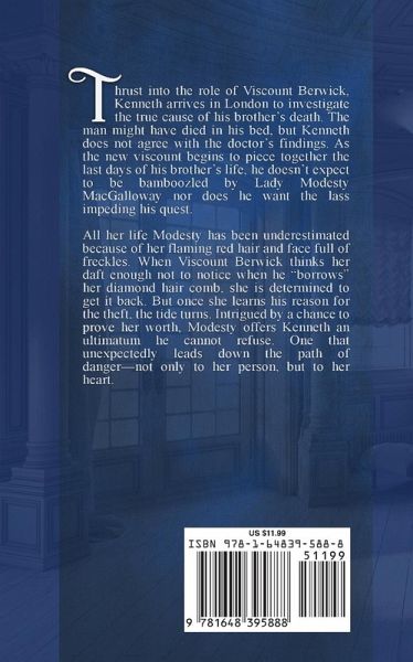Thrust into the role of Viscount Berwick, Kenneth arrives in London to investigate the true cause of his brother's death. The man might have died in his bed, but Kenneth does not agree with the doctor's findings. As the new viscount begins to piece together the last days of his brother's life, he doesn't expect to be bamboozled by Lady Modesty MacGalloway nor does he want the lass impeding his quest. All her life Modesty has been underestimated because of her flaming red hair and face full of freckles. When Viscount Berwick thinks her daft enough not to notice when he "borrows" her diamond hair comb, she is determined to get it back. But once she learns his reason for the theft, the tide turns. Intrigued by a chance to prove her worth, Modesty offers Kenneth an ultimatum he cannot refuse. One that unexpectedly leads down the path of danger-not only to her person, but to her heart.