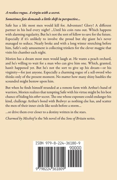 A restless rogue. A virgin with a secret. Sometimes fate demands a little shift in perspective... Safir has a life most men would kill for. Adventure! Glory! A different partner in his bed every night! ...Until his coin runs out. Which happens with alarming regularity. But he's not the sort of fellow to save for the future. Especially if it's unlikely to involve the proud but shy giant he's never managed to seduce. Nearly broke and with a long winter stretching before him, Safir's only amusement is collecting trinkets for the clever magpie that visits his chamber each night. + Morien has a dream most men would laugh at. He wants a peach orchard, and he's willing to wait for a man who can give him one. Which, granted, hasn't happened yet. But he's not the sort to give up his dream-or his virginity-for just anyone. Especially a charming rogue of a sell-sword who thinks only of the present moment. No matter how many shiny baubles the scoundrel might bestow upon him. + But when he finds himself stranded at a remote farm with Arthur's band of warriors, Morien realizes that tempting Safir with his virtue might be his best chance of hiding his other secret. The one whose exposure could endanger his kind, challenge Arthur's bond with Bedwyr as nothing else has, and scatter the men of their inner circle like seeds before a storm... ...or drive them ever closer to a destiny written in the stars. + CHARMED BY MISCHIEF is the 5th novel of the SONS OF BRITAIN series. Tropes: rogue/virgin, love lessons, secret identity Content Notes: battle violence, a main character's memory of an intimate situation between his adolescent self and an adult