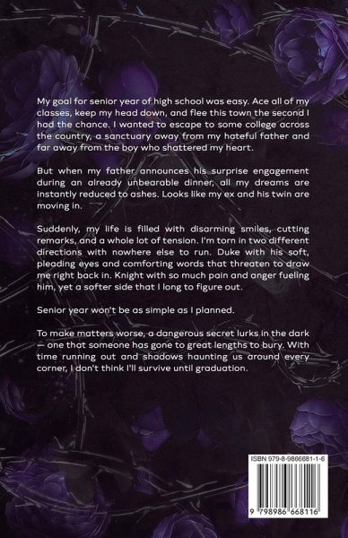 My goal for senior year of high school was easy. Ace all of my classes, keep my head down, and skip town the second I got a chance. I wanted to escape to some college across the country. Away from my hateful father and far away from the boy who broke my heart. When my dad drags me to dinner one night and announces his surprise engagement, all of those hopes go up in flames. Looks like my ex-boyfriend and his twin are about to become my stepbrothers. Suddenly, my life is filled with disarming smiles, cutting words, and a whole lot of tension. But there's a secret that threatens to undo us all. A secret that someone killed to keep quiet. I don't think I'll survive until graduation. *This is a high school bully, stepbrother romance with mature themes that may be difficult for some readers. One brother is sweet and the other is vicious, but the FMC Remi gets caught up with both in this why-choose, MFM relationship. Please check full trigger warning page before deciding if this book is right for you.*