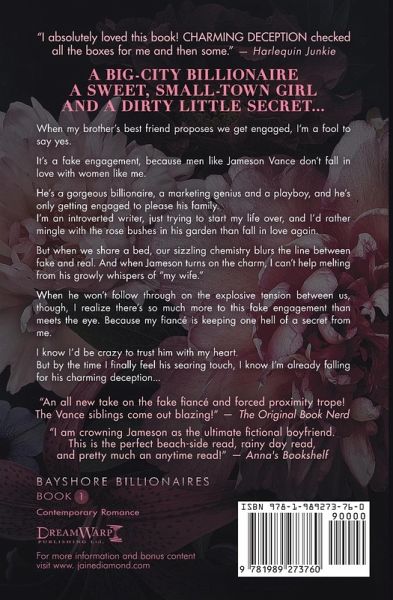 A steamy, one bed, fake fiancé standalone romance about a big-city billionaire, a sweet, small-town girl, and a dirty little secret... When my brother's best friend proposes we get engaged, I'm a fool to say yes. It's a fake engagement, because men like Jameson Vance don't fall in love with women like me. He's a gorgeous billionaire, a marketing genius and a playboy, and he's only getting engaged to please his family. I'm an introverted writer, just trying to start my life over, and I'd rather mingle with the rose bushes in his garden than fall in love again. But when we share a bed, our sizzling chemistry blurs the line between fake and real. And when Jameson turns on the charm, I can't help melting from his growly whispers of "my wife." When he won't follow through on the explosive tension between us, though, I realize there's so much more to this fake engagement than meets the eye. Because my fiancé is keeping one hell of a secret from me. I know I'd be crazy to trust him with my heart. But by the time I finally feel his searing touch, I know I'm already falling for his charming deception.