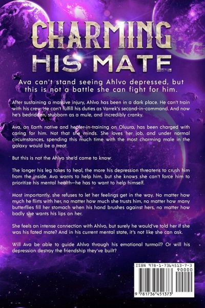 After sustaining a massive injury, Ahlvo has been in a dark place. He can't train with his crew. He can't fulfill his duties as Varrek's second-in-command. And now he's bedridden, stubborn as a mule, and incredibly cranky. Ava, an Earth native and healer-in-training on Oluura, has been charged with caring for him. Not that she minds. She loves her job, and under normal circumstances, spending this much time with the most charming male in the galaxy would be a treat. But this is not the Ahlvo she'd come to know. The longer his leg takes to heal, the more his depression threatens to crush him from the inside. Ava wants to help him, but she knows she can't force him to prioritize his mental health-he has to want to help himself. Most importantly, she refuses to let her feelings get in the way. No matter how much he flirts with her, no matter how much she trusts him, no matter how many butterflies fill her stomach when his hand brushes against hers, no matter how badly she wants his lips on her. She feels an intense connection with Ahlvo, but surely he would've told her if she was his fated mate? And in his current mental state, it's not like she can ask. Will Ava be able to guide Ahlvo through his emotional turmoil? Or will his depression destroy the friendship they've built? Charming His Mate is a full-length sci-fi romance featuring a charismatic, golden-skinned alien with a wounded leg and a head full of sadness. He's desperate to win the heart of the curvy 32-year-old heroine tasked with being his healer, but the voice in his head has him convinced he doesn't deserve her. If you like huge, sexy aliens, friends to lovers, steamy love scenes, and happily ever afters, you'll love this series!