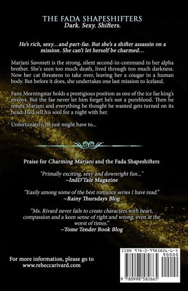 *BEST URBAN FANTASY ROMANCE ~ 2020 PRISM Awards for Excellence in Paranormal Romance* Discover USA Today bestselling author Rebecca Rivard's world of dark shifters and seductive fae. He's rich, sexy--and part-fae. But she's a shifter assassin on a mission. She can't let herself be charmed. Marjani is the strong, silent second-in-command to her alpha brother. She's seen too much death, lived through too much darkness. Now her cat threatens to take over, leaving her a cougar in a human body. But before it does, she undertakes one last mission to Iceland. Fane holds a prestigious position as an envoy for the ice fae king, but the fae never let him forget he's not a pureblood. When he meets the beautiful shifter, everything he thought he wanted gets turned on its head. He'd sell his soul for a night with her. Unfortunately, he just might have to... NOTE: Charming Marjani is the second book in the Baltimore Earth Fada Darktime Trilogy (along with Saving Jace and Adric's Heart). All books in the Fada Shapeshifter Series are standalone with an HEA, but the people, clans, and stories interconnect. If you crave steamy paranormal romance and intense emotional storylines, this book is for you