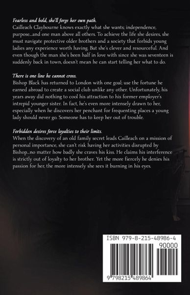 Fearless and bold, she'll forge her own path. Cailleach Claybourne knows exactly what she wants; independence, purpose…and one man above all others. To achieve the life she desires, she must navigate protective older brothers and a society that forbids young ladies any experience worth having. But she's clever and resourceful. And even though the man she's been half in love with since she was seventeen is suddenly back in town, doesn't mean he can start telling her what to do. There is one line he cannot cross. Bishop Black has returned to London with one goal; use the fortune he earned abroad to create a social club unlike any other. Unfortunately, his years away did nothing to cool his attraction to his former employer's intrepid younger sister. In fact, he's even more intensely drawn to her, especially when he discovers her penchant for frequenting places a young lady should never go. Someone has to keep her out of trouble. Forbidden desires force loyalties to their limits. When the discovery of an old family secret leads Cailleach on a mission of personal importance, she can't risk having her activities disrupted by Bishop…no matter how badly she craves his kiss. He claims his interference is strictly out of loyalty to her brother. Yet the more fiercely he denies his passion for her, the more intensely she sees it burning in his eyes.
