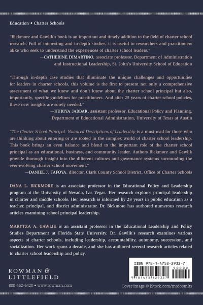 Dana L. Bickmore is an associate professor in the Educational, Policy, and Leadership program at the University of Nevada Las Vegas. Her research explores principal leadership in middle and charter schools. Her research is informed by her 28 years in public education as a teacher, principal, and district administrator. Dr. Bickmore has authored numerous research articles examining school principal leadership. Marytza A. Gawlik is an assistant professor in the Educational Leadership and Policy Studies department at Florida State University. Dr. Gawlik's research examines various aspects of charter schools including leadership, accountability, autonomy, succession and socialization. Her work spans a decade and she has authored several research articles related to charter school leadership and policy.