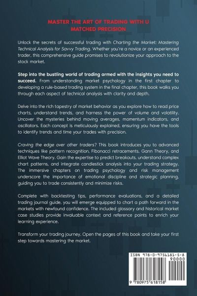 Master the Art of Trading with Unmatched Precision Unlock the secrets of successful trading with Charting the Market: Mastering Technical Analysis for Savvy Trading. Whether you're a novice exploring your first trades or a seasoned trader seeking to refine your skills, this comprehensive guide is designed to transform your approach to the stock market and elevate your trading strategies to new heights. Trading is an art as much as it is a science, and this book is your gateway to mastering both. It begins by delving into the foundational principles of market psychology, helping you understand the critical role that emotions, cognitive biases, and crowd behavior play in market movements. By grasping the psychological dynamics of the market, you will be better prepared to make rational, well-informed decisions even in volatile conditions. From there, the book takes you step-by-step through the fundamentals of technical analysis-the cornerstone of effective trading. Learn to interpret price charts with precision, uncover the significance of trend analysis, and utilize key tools such as moving averages to identify opportunities in the market. The chapters are filled with detailed explanations and practical examples, ensuring you build a solid foundation in reading and analyzing market trends. As you progress, you'll unlock advanced trading techniques to give you a competitive edge. Gain mastery over sophisticated strategies like pattern recognition, Fibonacci retracements, Gann Theory, and Elliott Wave Theory. Discover how to integrate candlestick analysis into your decision-making process, predict breakouts, and develop a keen eye for recognizing complex chart patterns. These skills will empower you to anticipate market moves with confidence and precision. But trading isn't just about technical tools-it's also about strategy, discipline, and risk management. The book emphasizes the importance of a well-structured trading plan, guiding you to set clear goals, define entry and exit points, and establish risk parameters that protect your capital. Comprehensive chapters on trading psychology address the challenges of maintaining emotional discipline, helping you overcome fear, greed, and impulsive behavior that can derail your success. For those seeking practical application, the book offers invaluable guidance on backtesting strategies, evaluating performance, and maintaining a detailed trading journal. These tools will enable you to refine your approach, learn from your successes and mistakes, and continuously improve your trading methodology. Additionally, a glossary of essential terms and historical market case studies provide vital context, helping you connect theoretical knowledge with real-world examples. Whether your goal is to trade full-time, build a secondary income stream, or simply better understand the movements of the stock market, Charting the Market equips you with the knowledge and tools to succeed. With its emphasis on both the technical and psychological aspects of trading, this book is a must-read for anyone serious about thriving in today's competitive markets. Transform your trading journey. Open the pages of this book and take your first step towards mastering the art and science of trading with confidence, precision, and a winning edge.