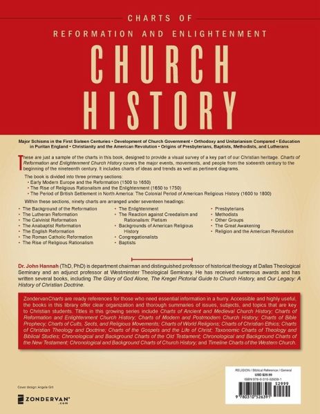 Major Schisms in the First Sixteen Centuries · Development of Church Government · Orthodoxy and Unitarianism Compared · Education in Puritan England · Christianity and the American Revolution · Origins of Presbyterians, Baptists, Methodists, and Lutherans These are just a sample of the charts in this book, designed to provide a visual survey of a key part of our Christian heritage. Charts of Reformation and Enlightenment Church History covers the major events, movements, and people from the sixteenth century to the beginning of the nineteenth century. It includes charts of ideas and trends as well as pertinent diagrams. The book is divided into three primary sections: · Early Modern Europe and the Reformation (1500 to 1650) · The Rise of Religious Rationalism and the Enlightenment (1650 to 1750) · The Period of British Settlement in North America: The Colonial Period of American Religious History (1600 to 1800) Within these sections, ninety charts are arranged under seventeen headings: 1. The Background of the Reformation 2. The Lutheran Reformation 3. The Calvinist Reformation 4. The Anabaptist Reformation 5. The English Reformation 6. The Roman Catholic Reformation 7. The Rise of Religious Rationalism 8. The Enlightenment 9. The Reaction against Creedalism and Rationalism: Pietism 10. Backgrounds of American Religious History 11. Congregationalists 12. Baptists 13. Presbyterians 14. Methodists 15. Other Groups 16. The Great Awakening 17. Religion and the American Revolution
