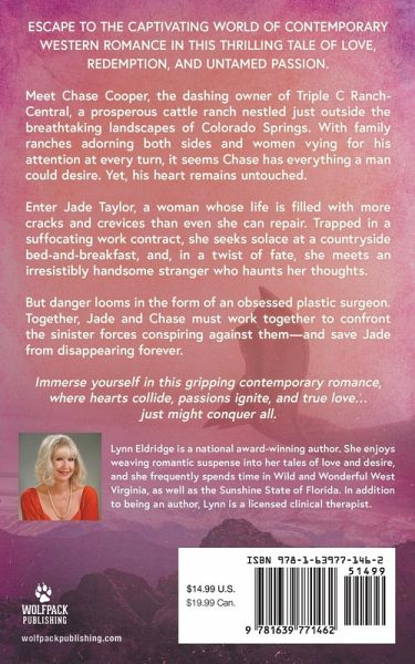 Escape to the captivating world of contemporary western romance in this 2024 Independent Press Award Winner-a thrilling tale of love, redemption, and untamed passion. Meet Chase Cooper, the dashing owner of Triple C Ranch-Central, a prosperous cattle ranch nestled just outside the breathtaking landscapes of Colorado Springs. With family ranches adorning both sides and women vying for his attention at every turn, it seems Chase has everything a man could desire. Yet, his heart remains untouched. Enter Jade Taylor, a woman whose life is filled with more cracks and crevices than even she can repair. Trapped in a suffocating work contract, she seeks solace at a countryside bed-and-breakfast, and, in a twist of fate, she meets an irresistibly handsome stranger who haunts her thoughts. But danger looms in the form of an obsessed plastic surgeon. Together, Jade and Chase must work together to confront the sinister forces conspiring against them-and save Jade from disappearing forever. Immerse yourself in this gripping contemporary romance, where hearts collide, passions ignite, and true love...just might conquer all. "If you love western romance, Lynn Eldridge's Triple C Ranch series is a must read!" -Kat Martin, New York Times bestselling author
