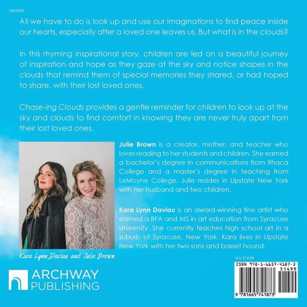 All we have to do is look up and use our imaginations to find peace inside our hearts, especially after a loved one leaves us. But what is in the clouds? In this rhyming inspirational story, children are led on a beautiful journey of inspiration and hope as they gaze at the sky and notice shapes in the clouds that remind them of special memories they shared, or had hoped to share, with their lost loved ones. Chase-ing Clouds provides a gentle reminder for children to look up at the sky and clouds to find comfort in knowing they are never truly apart from their lost loved ones.