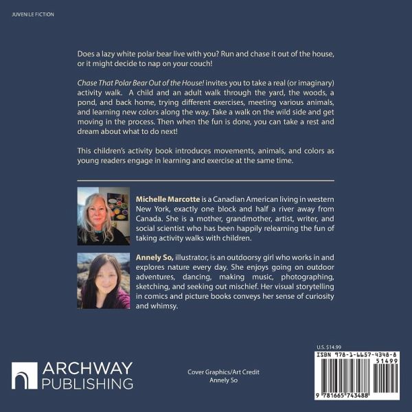 Does a lazy white polar bear live with you? Run and chase it out of the house, or it might decide to nap on your couch! Chase That Polar Bear Out of the House! invites you to take a real (or imaginary) activity walk. A child and an adult walk through the yard, the woods, a pond, and back home, trying different exercises, meeting various animals, and learning new colors along the way. Take a walk on the wild side and get moving in the process. Then when the fun is done, you can take a rest and dream about what to do next! This children's activity book introduces movements, animals, and colors…mehr