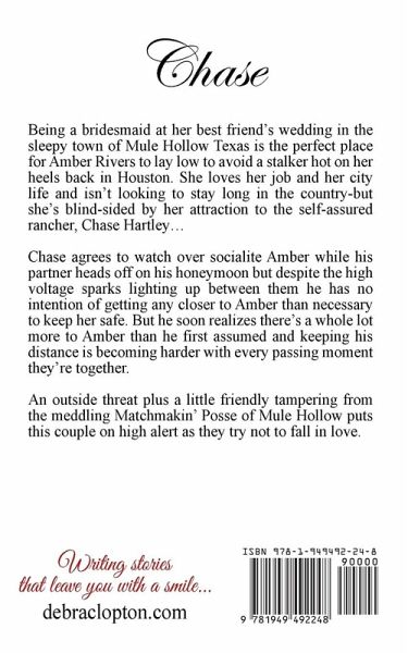 Being a bridesmaid at her best friend's wedding in the sleepy town of Mule Hollow Texas is the perfect place for Amber Rivers to lay low to avoid a stalker hot on her heels back in Houston. She loves her job and her city life and isn't looking to stay long in the country-but she's blindsided by her attraction to the self-assured rancher, Chase Hartley… Chase agrees to watch over socialite Amber while his partner heads off on his honeymoon but despite the high voltage sparks lighting up between them he has no intention of getting any closer to Amber than necessary to keep her safe. But he soon realizes there's a whole lot more to Amber than he first assumed and keeping his distance is becoming harder with every passing moment they're together. An outside threat plus a little friendly tampering from the meddling Matchmakin' Posse of Mule Hollow puts this couple on high alert as they try not to fall in love.