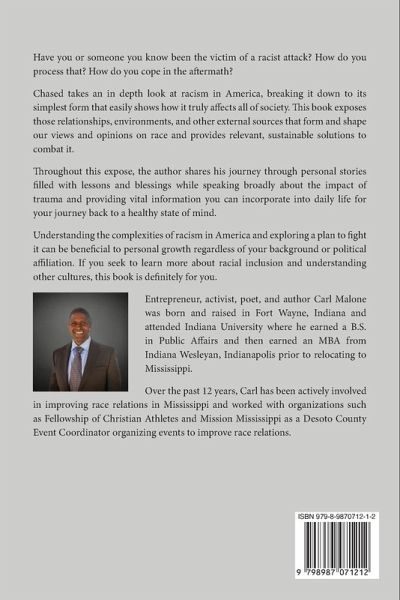 Have you or someone you know been the victim of a racist attack? How do you process that? How do you cope in the aftermath? Chased takes an in depth look at racism in America, breaking it down to its simplest form that easily shows how it truly affects all of society. This book exposes those relationships, environments, and other external sources that form and shape our views and opinions on race and provides relevant, sustainable solutions to combat it. Throughout this expose, the author shares his journey through personal stories filled with lessons and blessings while speaking broadly about the impact of trauma and providing vital information you can incorporate into daily life for your journey back to a healthy state of mind. Understanding the complexities of racism in America and exploring a plan to fight it can be beneficial to personal growth regardless of your background or political affiliation. If you seek to learn more about racial inclusion and understanding other cultures, this book is definitely for you. Entrepreneur, activist, poet, and author Carl Malone was born and raised in Fort Wayne, Indiana and attended Indiana University where he earned a B.S. in Public Affairs and then earned an MBA from Indiana Wesleyan, Indianapolis prior to relocating to Mississippi. Over the past 12 years, Carl has been actively involved in improving race relations in Mississippi and worked with organizations such as Fellowship of Christian Athletes and Mission Mississippi as a Desoto County Event Coordinator organizing events to improve race relations.