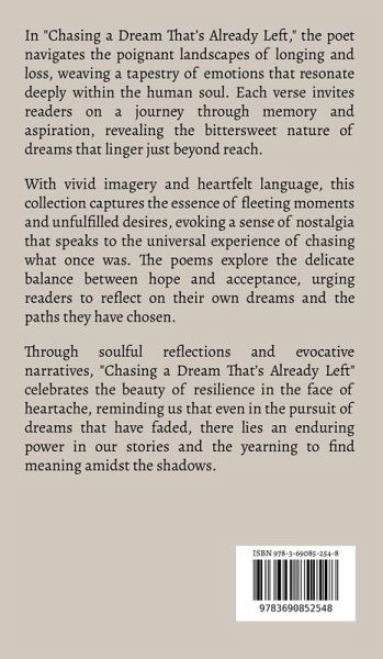 In "Chasing a Dream That's Already Left," the poet navigates the poignant landscapes of longing and loss, weaving a tapestry of emotions that resonate deeply within the human soul. Each verse invites readers on a journey through memory and aspiration, revealing the bittersweet nature of dreams that linger just beyond reach. With vivid imagery and heartfelt language, this collection captures the essence of fleeting moments and unfulfilled desires, evoking a sense of nostalgia that speaks to the universal experience of chasing what once was. The poems explore the delicate balance between hope and acceptance, urging readers to reflect on their own dreams and the paths they have chosen. Through soulful reflections and evocative narratives, "Chasing a Dream That's Already Left" celebrates the beauty of resilience in the face of heartache, reminding us that even in the pursuit of dreams that have faded, there lies an enduring power in our stories and the yearning to find meaning amidst the shadows.