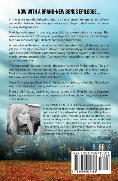 Now with a brand-new bonus epilogue... In the tense months following 9/11, a chance encounter sparks an unlikely connection between two strangers-a young college student and a marine on his way to Afghanistan. Mark has no interest in romance, especially just a week before he deploys. But when he sees a man follow a pretty waitress from a Providence hotspot, his gut tells him she's in danger. He feels compelled to intervene. Amanda hoped to learn the restaurant business when she took the waitressing job, but so far all she's learned is how to fend off handsy guys. When she leaves work one night, she hears a patron following her and is beyond grateful when a man intervenes to protect her. As she and Mark spend time together, attraction grows between them. The more Mark feels for Amanda, the more he worries for her safety. The guy who followed her was no drunken frat boy hoping to get her phone number. Mark's instincts have never let him down, and his instincts tell him her stalker is still close-and he has sinister intentions. Once Mark says goodbye, there'll be nobody there to protect her. Nobody to keep their future from being shattered by violence. From a USA Today bestselling author comes a thrilling romantic suspense featuring a military hero, a courageous but vulnerable heroine, and a stalker in the shadows.
