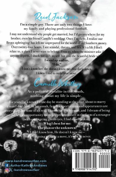 Gently, he lifts my veil, and instead of flipping it back over my head, he slips under it to be close to me. What had acted as a filter is now gone, and everything about him is vivid, sharp, and-just for today-mine. Reid Jackson I objected at her wedding. Me, a complete stranger and my brother's plus one. But over the last twenty-four hours, if you saw what I saw and heard what I heard, you'd do the same thing. Only now, I have a wife and she's looking at me for answers I don't have.The problem is, I'm a simple guy. There are only two things I love: my family and playing professional football. I'm a New Yorker, and this girl, well she comes from old Southern money. It's a life I don't relate to, and a place I don't want to belong. We couldn't be more different if we tried. Even so, when the minister asked if anyone objected, I shocked not only myself but also the beautiful bride when I stood up and said, "I do." I don't know her, she doesn't know me-but deep down, I knew I had to make that move. Camille Whitley For years I've known I'd one day be standing at the altar, about to marry a man I don't love. As a socialite in the South, family expectations and appearances are everything, but none of it's real. I hate what I've become, and I dream of being free. So, when an opportunity suddenly presents itself in the form of a stranger with long legs, broad shoulders and captivating green eyes, I find myself asking what's best for me: the plan or the unknown? I don't know him, he doesn't know me-but if I'm going to make a move, it's now or never. Author's Note: A steamy, swoony marriage of convenience with a tall dark and handsome hero determined to save the day and a plucky heroine who is starting to wonder if opposites do attract and their marriage might actually be something more.
