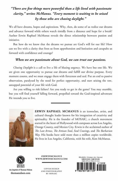 Chasing Daylight (previously published as Seizing Your Devine Moment) is a call to live a life of blazing urgency. We have but one life. We are given one opportunity to pursue our dreams and fulfill our divine purpose. Every moment counts, and we must engage them with fierceness and zeal. Put an end to passive observation, paralyzed by the need for perfect opportunity, and start seizing the raw, untapped potential of your life with God. Are you willing to risk failure? Are you ready to get in the game? You may stumble, but you will find yourself falling forward, propelled toward the God-inspired adventure He intends you to live.…mehr