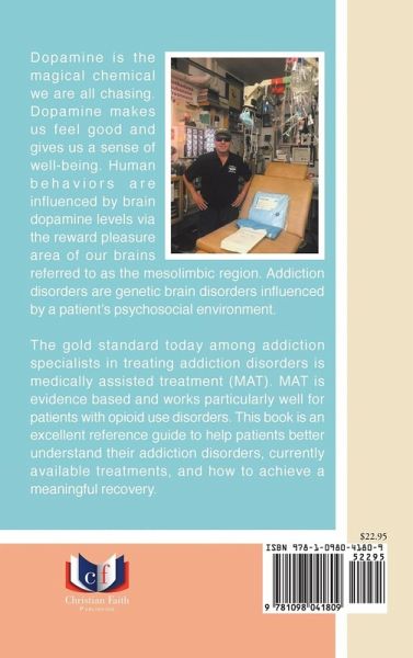 Dopamine is the magical chemical we are all chasing. Dopamine makes us feel good and gives us a sense of well-being. Human behaviors are influenced by brain dopamine levels via the reward pleasure area of our brains referred to as the mesolimbic region. Addiction disorders are genetic brain disorders influenced by a patient's psychosocial environment. The gold standard today among addiction specialists in treating addiction disorders is medically assisted treatment (MAT). MAT is evidence based and works particularly well for patients with opioid use disorders. This book is an excellent reference guide to help patients better understand their addiction disorders, currently available treatments, and how to achieve a meaningful recovery.
