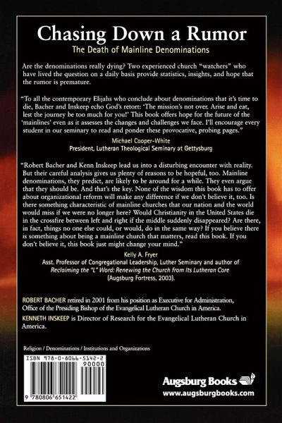 Bacher and Inskeep believe that mainline denominationsserve as caretakers of the important Americanexpressions of Christianity, and if they are weak or lost, society and the universal church will be the worse for it. Theyargue that a fundamentally American form of mainlinedenominationalism can and will endure, despite the rumor ofits decline. The authors examine six "rumors" of the decline. Usinghistorical trends and current statistical information, theyanalyze the current situation and point to vitallessons, potential problems, and key challenges. They alsooffer helpful strategies and provide examples of whatdenominations are doing that show potential.