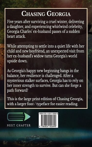 In the sequel to Winter's Captive, Georgia's happy new beginnings hang in the balance as her resilience is challenged by close confidantes, life-altering requests, and unknown pursuers. Five years after surviving a cruel winter, delivering a daughter, and experiencing whirlwind celebrity after telling her story, Georgia Charles' ex-husband passes of a sudden heart attack. While attempting to settle into a quiet life with her child and boyfriend Sean, her ex-husband's widow Julie visits - and turns Georgia's world upside down. The enthralling second novel in the eponymous series, Chasing Georgia is a story of redemption, forgiveness, and the knowledge that family is born not from blood, but from love and respect. As Julie presents Georgia with an earthshaking appeal, Sean tests her newfound confidence, and a stalker mysteriously surfaces, she relies on her inner strength - but can she find a way to forge a new path for herself? This is the large print edition of Chasing Georgia, with a larger font / typeface for easier reading.