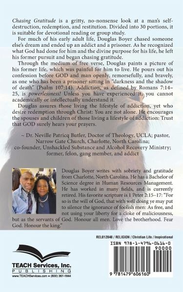 Chasing Gratitude is a gritty, no-nonsense look at a man's self-destruction, redemption, and restitution. Divided into 30 portions, it is suitable for devotional reading or group study. For much of his early adult life, Douglas Boyer chased someone else's dream and ended up an addict and a prisoner. As he recognized what God had done for him and the divine purpose for his life, he left his former pursuit and began chasing gratitude. Through the medium of free verse, Douglas paints a picture of his former life, which was painful for him to live. He pours out his confession before GOD and man openly, remorsefully, and bravely, as one who has been a prisoner sitting in "darkness and the shadow of death" (Psalm 107:14). Addiction, as defined by Romans 7:14-25, is powerlessness! Unless you have experienced it, you cannot academically or intellectually understand it. Douglas assures those living the lifestyle of addiction, yet who desire redemption through Christ: You are not alone. He encourages the spouses and children of those living a lifestyle of addiction: Trust that GOD surely hears your prayers.~ Dr. Neville Patricq Butler, Doctor of Theology, UCLA; pastor, Narrow Gate Church, Charlotte, North Carolina; co-founder, Unshackled Substance and Alcohol Recovery Ministry; former, felon, gang member, and addict"...for those whose family deals with the horrors of addiction, it gives solace and hope. It will also give insight for professionals and non-professionals who wish to help people under the helplessness of addiction."~ Kevin Morgan, editor